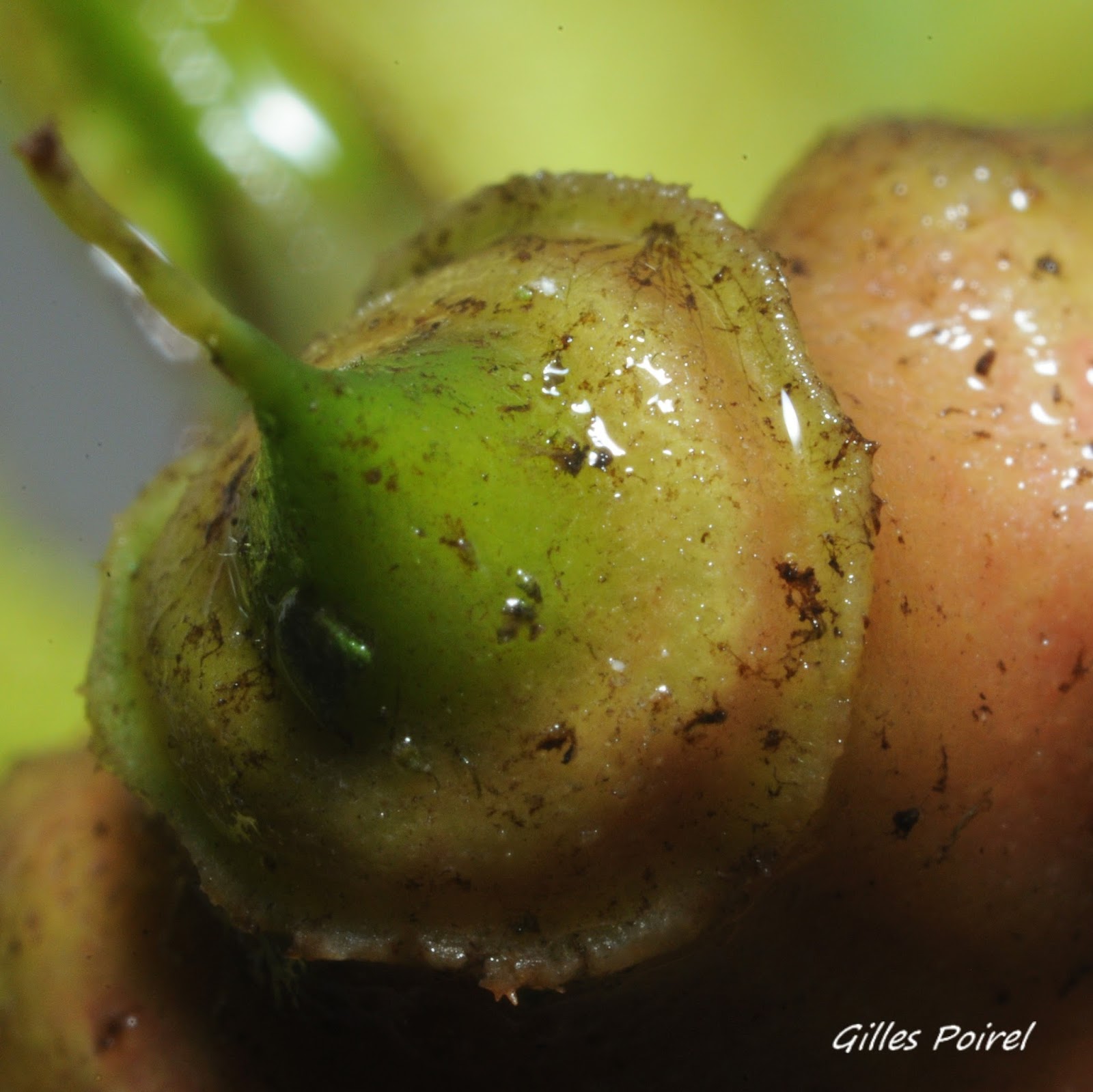 | Trapa natans. Fruit en formation , montrant le reste du style. Étang des Grands Graviers, Larnaud 39140. 2015/07/16. |