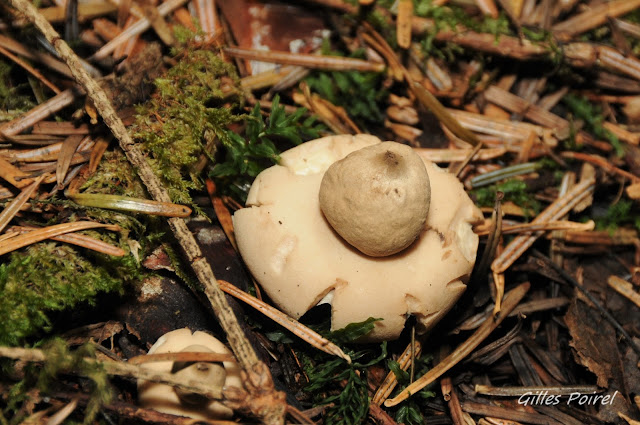 | Geastrum fimbriatum. Le Géastre sessile. Deux spécimens en forêt de conifères à des stades différents. Granges-sur-Baume 39210. 2014/09/01. |